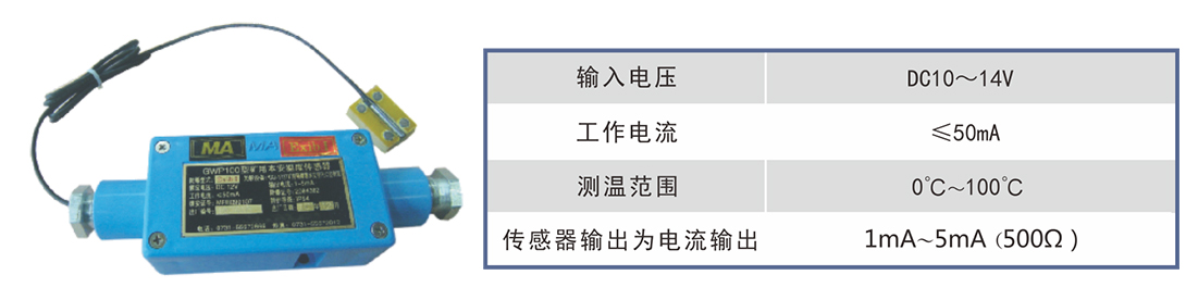 利用PT100磁性測溫傳感器檢測溫度,溫度變送器輸出同步變化的恒定電流。此傳感器具有體積小、靈敏度和精確度高、可靠性高等特點。主要應(yīng)用于煤礦
