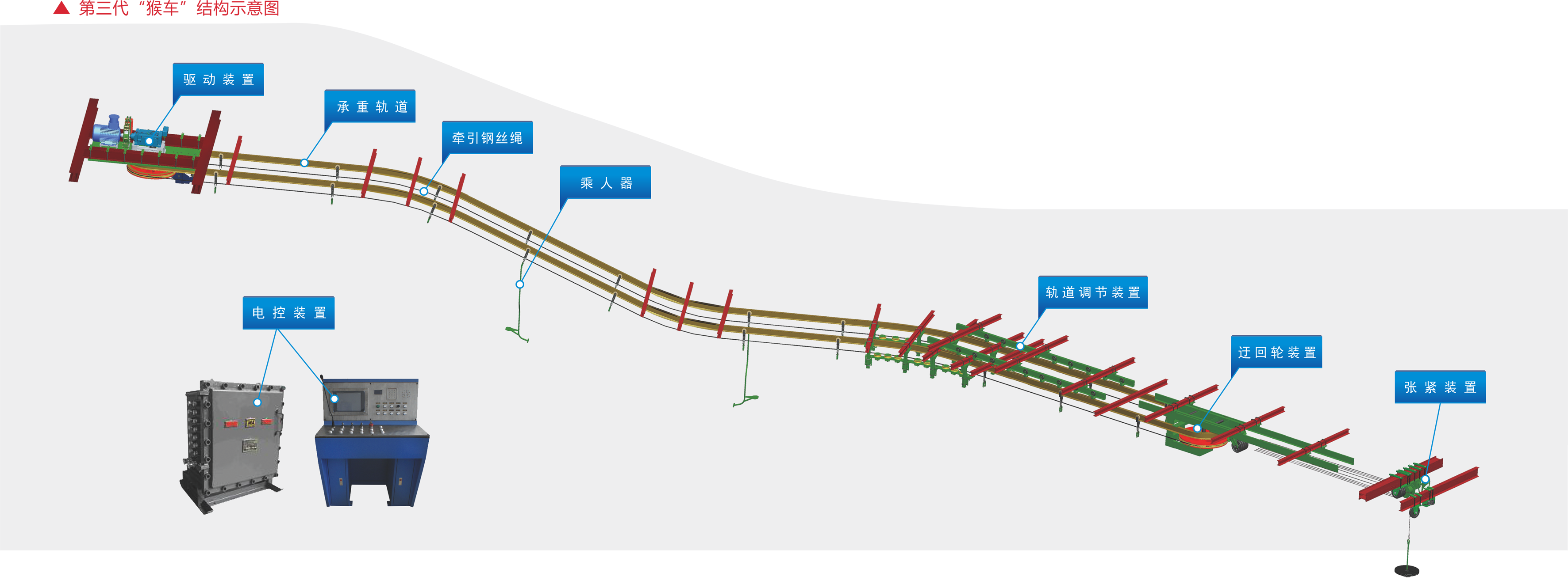 礦用繩牽引軌道式架空乘人裝置是傳統“猴車”更新換代的產品。它主要由驅動裝置、承重軌 道、牽引鋼絲繩、乘人器、迂回輪裝置、軌道調節(jié)裝置、張緊裝置、安全保護裝置及電控裝置等組 成。具有不掉繩、防脫繩、適用于大坡度多個同向彎或“S”型彎的巷道條件;且運量大、乘坐更舒適、安全性能更高,是一種新型的現代化礦山井下人員輸送設備。