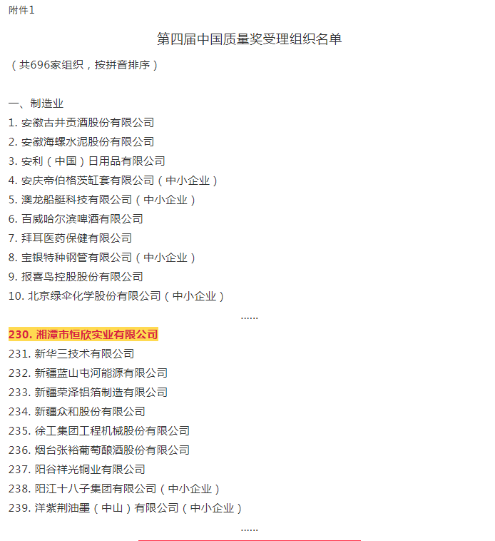 xiao12666@163.com【湘潭恒欣】入第四屆中國質(zhì)量獎(jiǎng)受理名單