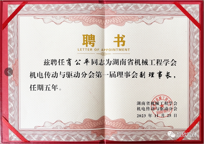 在本次會議中,【恒欣股份】董事長肖公平當選湖南省機械工程學會機電傳動與驅(qū)動分會第一屆理事會副理事長,這是對我司長期堅持技術(shù)創(chuàng)新的有力詮釋,也將進一步推動【恒欣股份】自主創(chuàng)新、自主研發(fā)的動力,為礦山提供更智能、更高效、更安全的機械裝備。肖董事長表示將認真履行好分會副理事長職責,與分會同仁攜手奮進,不遺余力地為分會工作開展貢獻力量。