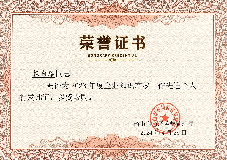 4月26日,韶山市委宣傳部和韶山市市場監(jiān)督管理局等單位聯(lián)合主辦了韶山市2024年“知識產(chǎn)權宣傳周”主題活動。活動現(xiàn)場上,由韶山市委常委、副市長鄒正光為榮獲知識產(chǎn)權榮譽的企業(yè)和個人進行頒獎和授牌。董事長肖公平接受鄒副市長為【恒欣股份】獲評國家知識產(chǎn)權示范企業(yè)的授牌,【恒欣股份】知識產(chǎn)權辦主任楊自攀被評為企業(yè)知識產(chǎn)權工作先進個人。