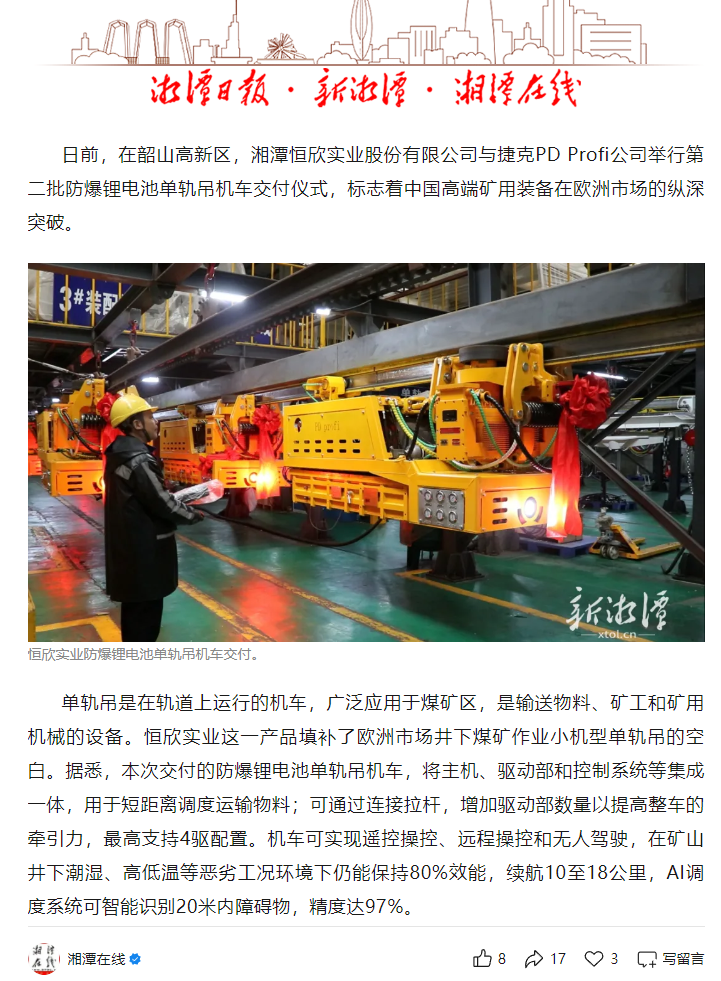 xiao12666@163.com國內(nèi)權(quán)威媒體報(bào)道我司單軌吊再次出口歐洲