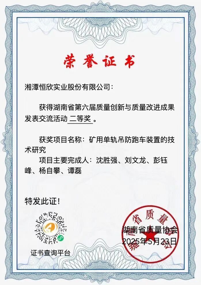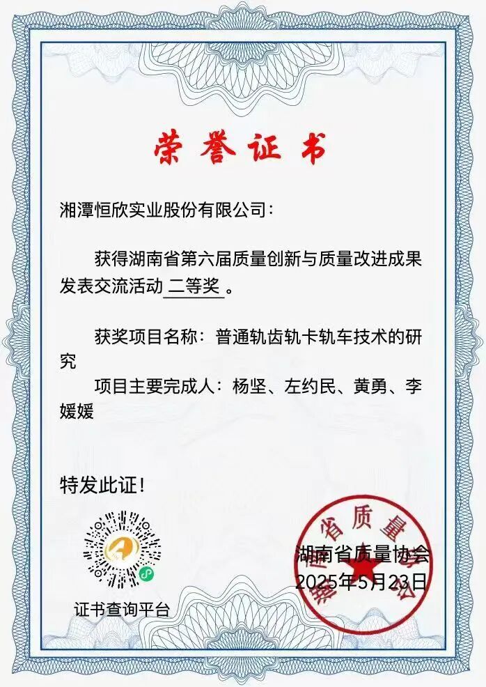 公司質(zhì)量管理工作亦在省級(jí)平臺(tái)上獲得高度認(rèn)可。在湖南省質(zhì)量協(xié)會(huì)第46次優(yōu)秀質(zhì)量管理小組表彰大會(huì)上,【恒欣股份】榮獲“湖南省第六屆質(zhì)量創(chuàng)新與質(zhì)量改進(jìn)成果”二等獎(jiǎng)兩項(xiàng),有軌QC小組獲“湖南省第46次QC小組成果二等獎(jiǎng)”,充分體現(xiàn)了公司在質(zhì)量創(chuàng)新與實(shí)踐方面的綜合實(shí)力。