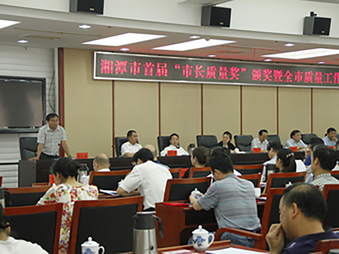 6月13日,湘潭市首屆“市長質(zhì)量獎(jiǎng)”頒獎(jiǎng)暨全市質(zhì)量工作會(huì)議在湘潭市政府會(huì)議室召開,省質(zhì)量技術(shù)監(jiān)督局蔣新祺局長、湘潭市委副書記、市長胡偉林、副市長吳小月等領(lǐng)導(dǎo)參加了會(huì)議。