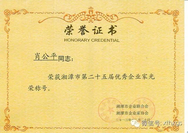 4.“湘潭恒欣”董事長(zhǎng)個(gè)人榮譽(yù):2013年被評(píng)為“湘潭市第25屆優(yōu)秀企業(yè)家”、“韶山市首屆道德模范”。
