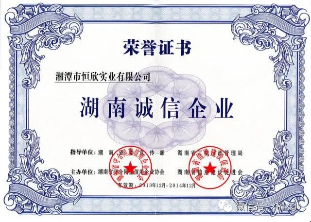 1.國(guó)家級(jí)榮譽(yù):2014年【湘潭恒欣】被評(píng)為“國(guó)家守合同重信譽(yù)公示企業(yè)”,榮獲“國(guó)家工商聯(lián)科學(xué)科技進(jìn)步獎(jiǎng)優(yōu)秀獎(jiǎng)”。2.省級(jí)榮譽(yù):2014年【湘潭恒欣】被評(píng)為“湖南省誠(chéng)信企業(yè)”、“湖南省十大知識(shí)產(chǎn)權(quán)領(lǐng)軍企業(yè)”、“省認(rèn)定企業(yè)技術(shù)中心”、“2013年湖南省守合同重信譽(yù)單位”、“湖南省高新技術(shù)企業(yè)”。