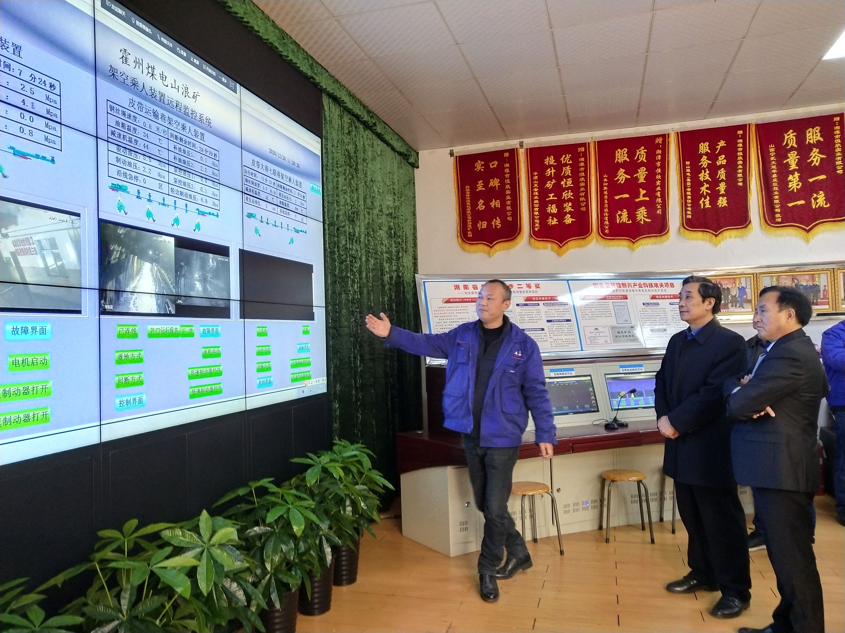 在【湘潭恒欣】會議室肖董事長向楊理事長一行介紹公司基本情況,并和楊理事長就礦用井下運輸技術和裝備的現(xiàn)狀和發(fā)展趨勢進行了深入的探討。隨后,肖董事長陪同楊理事長一行參觀了企業(yè)的榮譽展廳、物聯(lián)網集控中心、安全質量教育室、安全應急指揮中心、生產和辦公現(xiàn)場等區(qū)域。