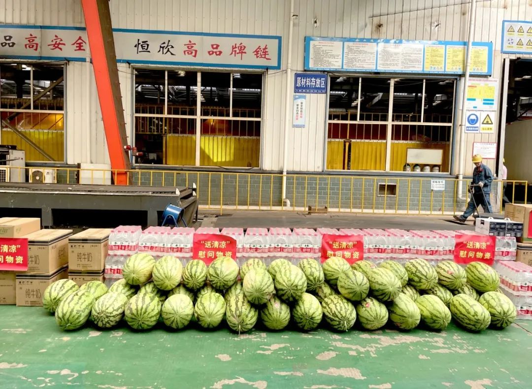 盛夏時(shí)節(jié),烈日炎炎。市委書記曹偉宏一行,在【恒欣股份】董事長肖公平的陪同下,來到車間為奮戰(zhàn)在高溫一線的員工送去了解暑降溫物品——防暑藥品、西瓜、礦泉水等,不僅傳遞了政府對(duì)高溫一線員工的關(guān)心,也向一線員工不畏酷熱、堅(jiān)守崗位的精神表達(dá)了敬意。