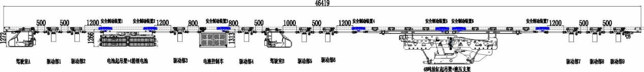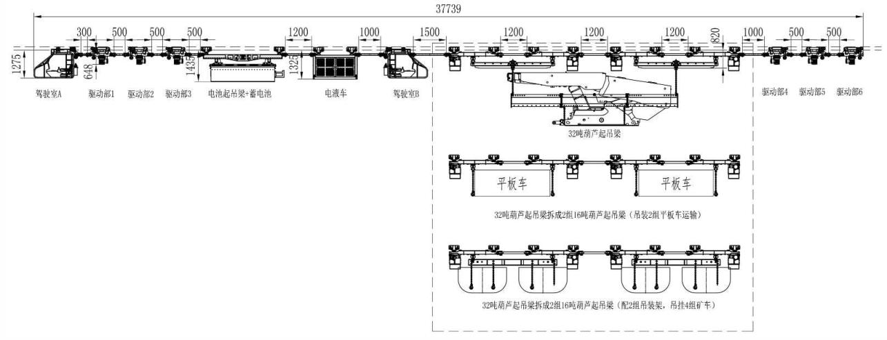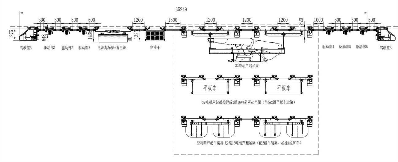 方式二:起吊梁位于最前端位置,適用于直接將液壓支架運輸?shù)焦ぷ髅媲醒畚恢眠\輸方式,采用葫蘆驅(qū)動形式起吊梁,也可拆解為小噸位起吊梁,用于運輸平板車、礦車等小型貨物。
