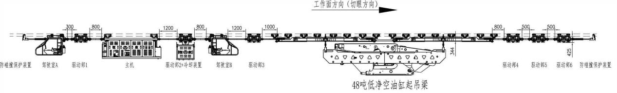 方式二:起吊梁位于最前端位置,適用于直接將液壓支架運輸?shù)焦ぷ髅媲醒畚恢眠\輸方式,采用低凈空油缸或葫蘆起吊梁,常用于大噸位液壓支架運輸。