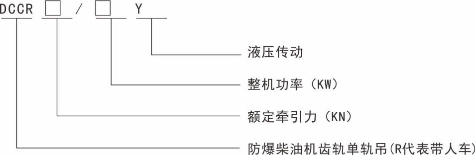 示列:型號DCCR420/160Y,表示額定牽引力420KN,柴油機(jī)功率160KW,柴油機(jī)動(dòng)力液壓驅(qū)動(dòng)齒軌單軌吊車。