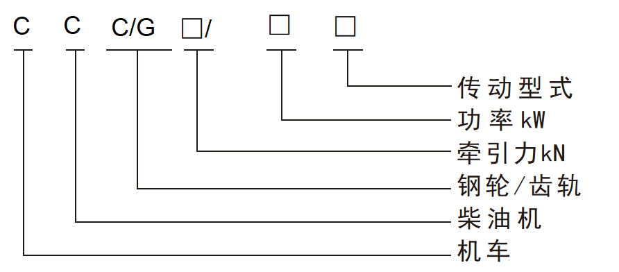 示例:CCG/C538/160Y:煤礦用防爆柴油機鋼輪/齒軌機車,牽引力538KN,柴油機功率160KW,液壓傳動。