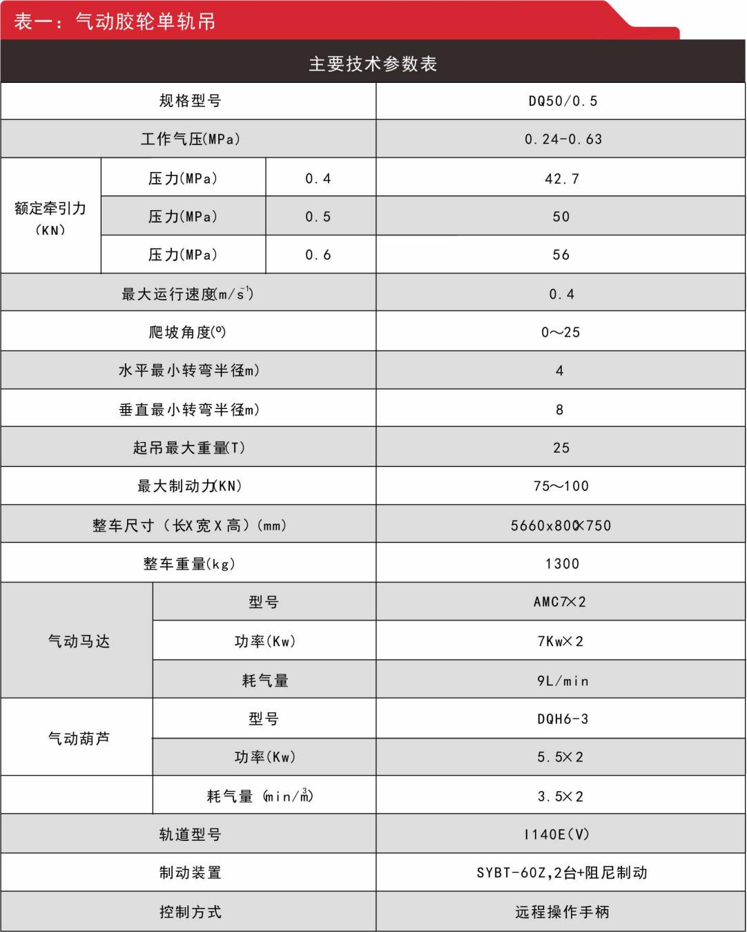 1.氣動(dòng)膠輪單軌吊參數(shù)及負(fù)載表