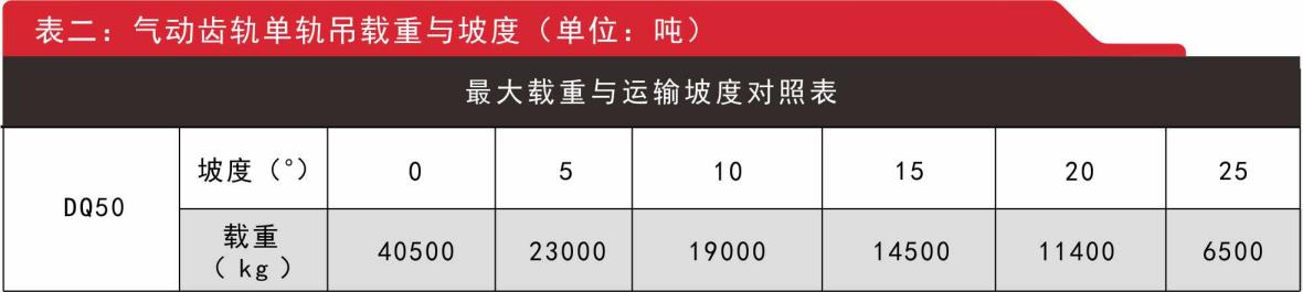 2.氣動(dòng)齒軌單軌吊參數(shù)及負(fù)載表