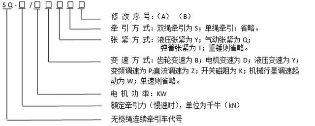 產(chǎn)品型號(hào)SQ-80/90B表示:額定牽引力為80KN、電機(jī)功率為90KW、齒輪變速、重錘張緊的無(wú)極繩連續(xù)牽